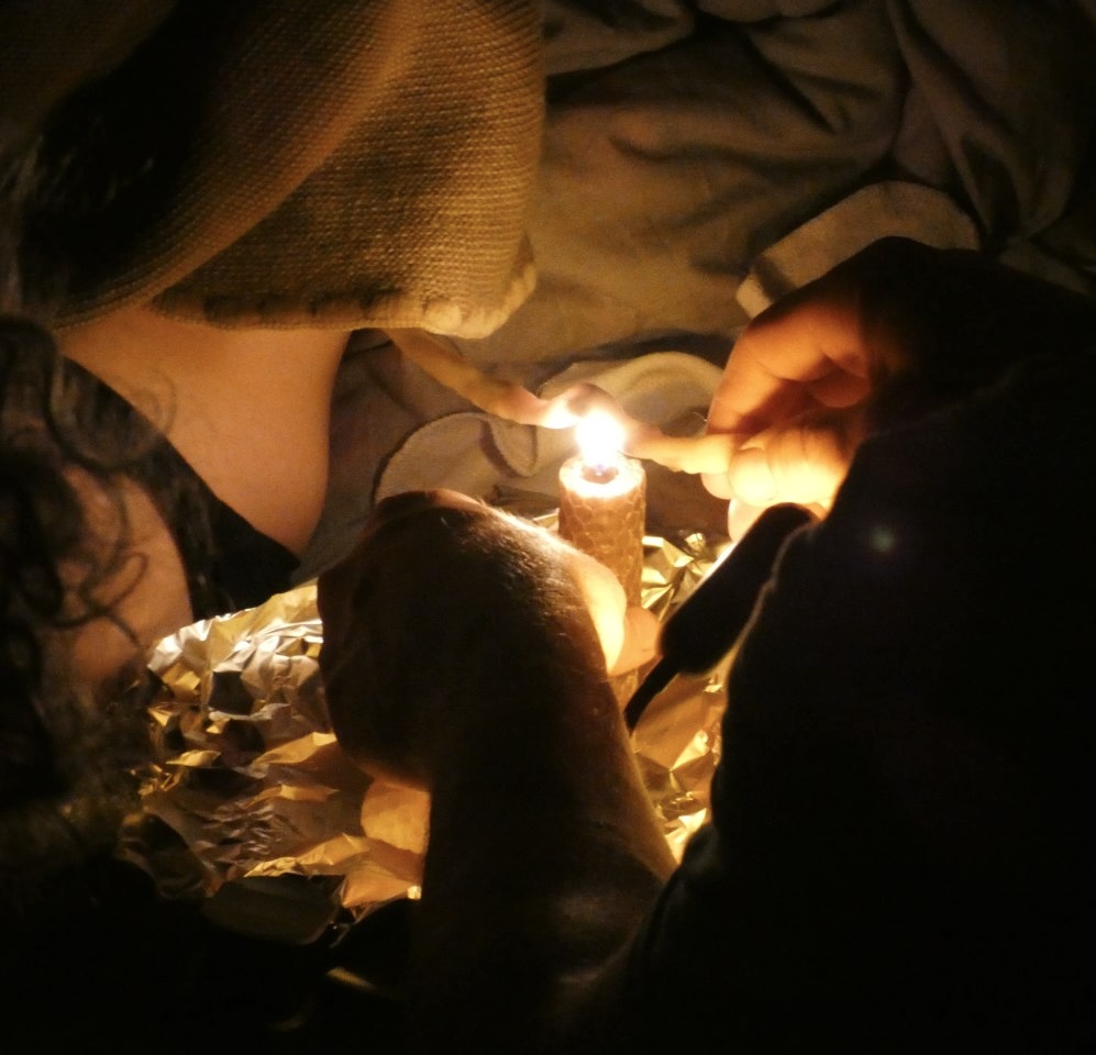 Abends bei 39+5: Mein Onkel war vor ein paar Tagen zu uns gereist, um uns bei der Geburt mit Nela zu unterstützen und im Wochenbett da zu sein. An diesem Abend hatten wir ein kuscheliges Feuer gemacht, Kekse gebacken und zusammen “My Octopus Teacher” geschaut. Bei Nela platzte die Fruchtblase nach diesem Film, sodass wir halb Ernst, halb im Scherz probieren wollten, ob wir die Geburt so starten könnten. Nach dem Film schaute ich in den Spiegel und mein Gesicht sah sehr weich und entspannt aus. Ich fühlte mich wie in Trance und musste lachen, wie „schnell“ mein Partner sich bewegte und sprach.
