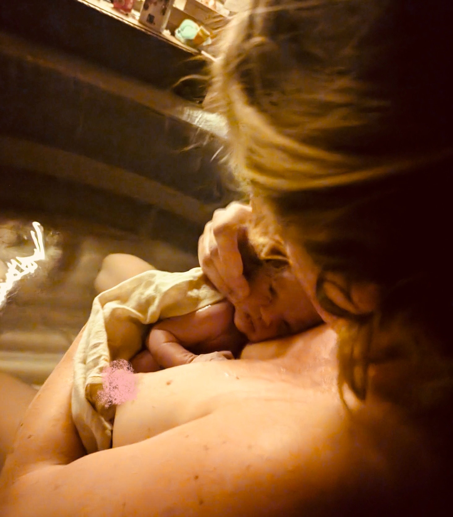 Ich hatte es geschafft! Mein Baby ganz allein, aus eigener Kraft und völlig ungestört, geboren. Nach gut 5 Stunden aktiver Geburt, hob ich Baby gegen 21 Uhr aus dem Wasser. Was für ein Gefühl! Nur sie und ich, Körper an Körper, keine fremden Hände, ganz in Ruhe, voller Bewunderung.