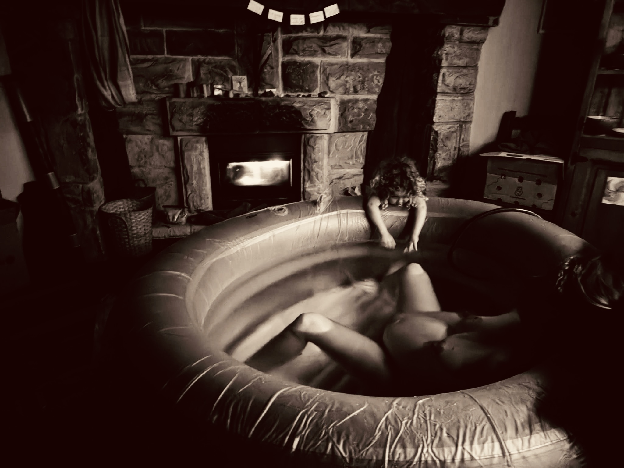 Öffnen, ich wollte mich „an Land“ öffnen und den Pool als allerletzte Option lassen. Das Feuer war nun im vollen Gange, die Lichterkette das einzige Licht im Raum – meine Geburtshöhle! Die Wellen wurden jetzt sehr intensiv, fast unerträglich. Und weil sich egal welche Position unangenehm anfühlte und ich langsam müde wurde, ging ich endlich in den Pool. Das Paradies!