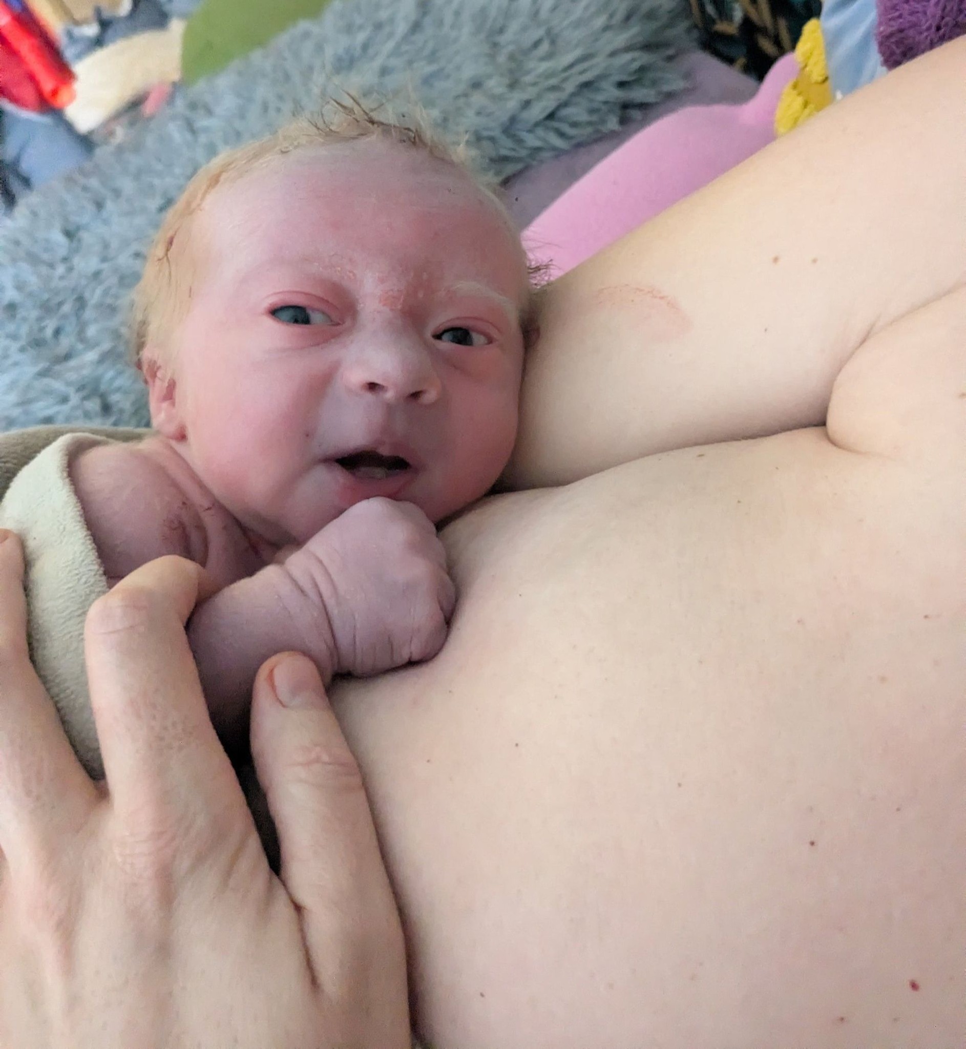 Neugeborenes mit rotblondem Haar liegt Haut an Haut auf seiner Mutter, die eine Alleingeburt trotz Nierenstein und ET+10 gemeistert hat.