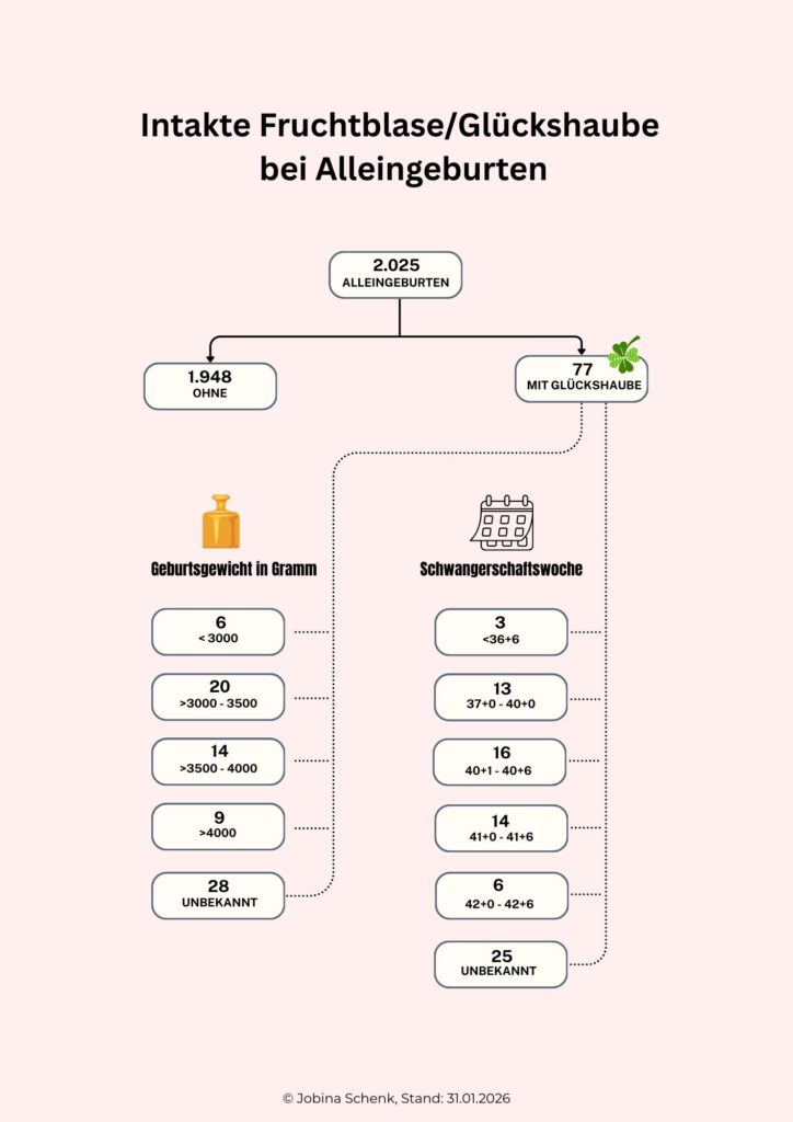In der Alleingeburtenstudie mit aktuell 2.014 durchgeführten Alleingeburten (Stand: 30.01.2026) gab es ebenfalls Kinder mit Glückshauben – und zwar nicht wenige. Innerhalb der gesamten Alleingeburten-Studie wurde die Glückshaube 77-mal gemeldet.