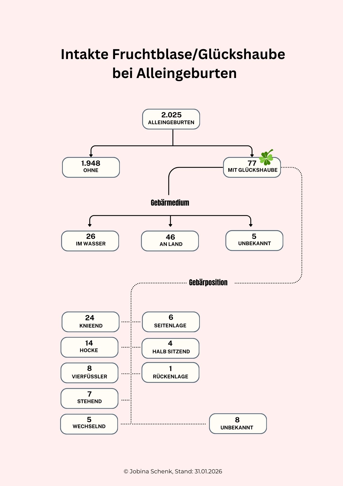 In der Alleingeburtenstudie mit aktuell 2.014 durchgeführten Alleingeburten (Stand: 30.01.2026) gab es ebenfalls Kinder mit Glückshauben – und zwar nicht wenige. Innerhalb der gesamten Alleingeburten-Studie wurde die Glückshaube 77-mal gemeldet.